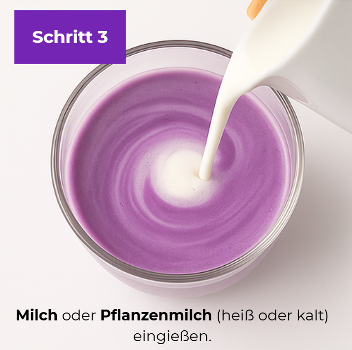 - Heiße Milch oder Pflanzenmilch (ca. 200 ml) dazugießen.